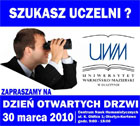 30 marca zapraszamy na Dzień Otwartych Dni Uniwersytetu Warmińsko-Mazurskiego. Program „Dnia Otwartych Drzwi" obejmuje prezentację oferty kształcenia, kryteriów kwalifikacji kandydatów na I rok studiów w roku akademickim 2010/2011 oraz prezentację Wydziałów i agend studenckich.