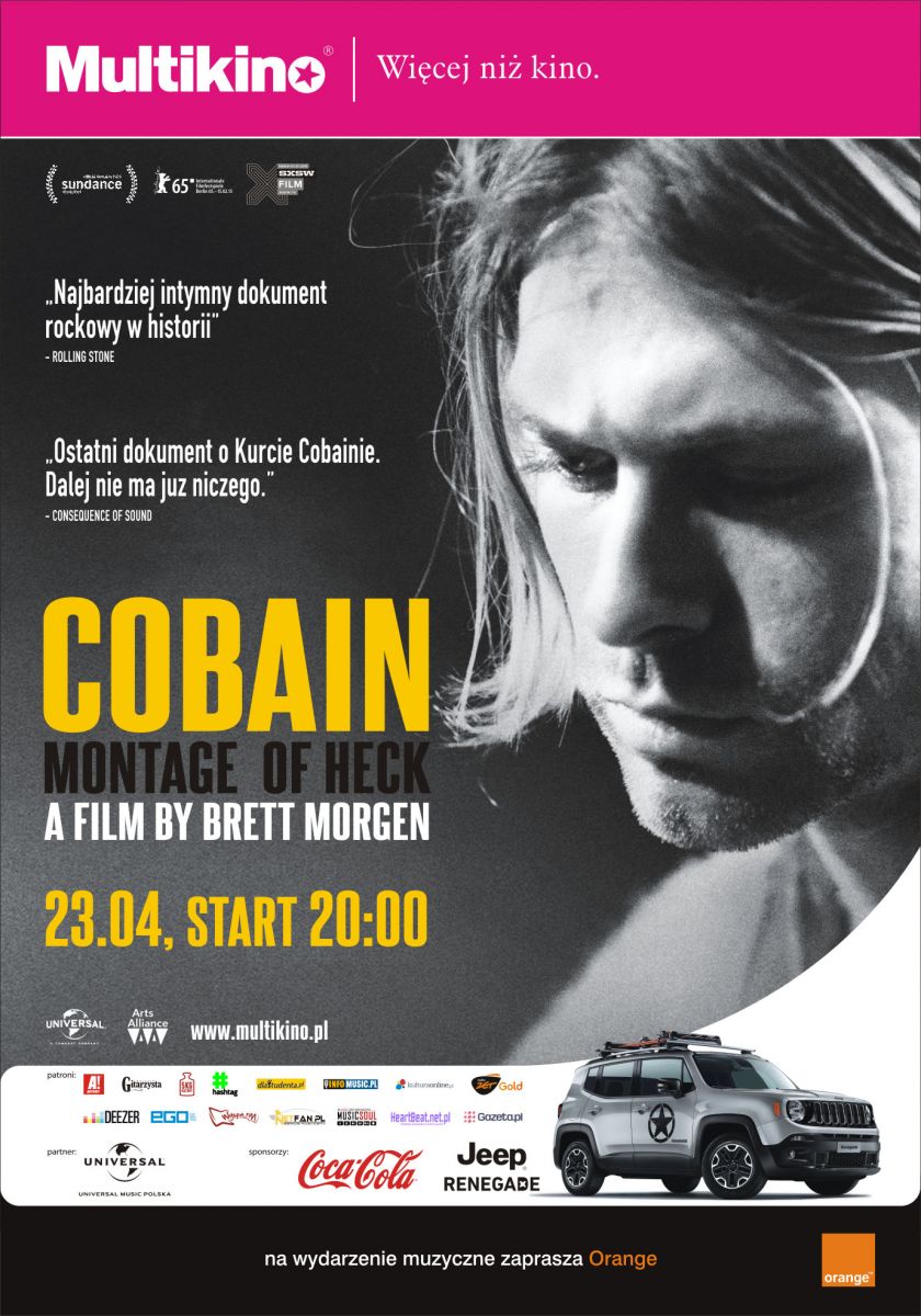 Doświadcz życia, muzyki oraz umysłu Kurta Cobaina, jak nigdy wcześniej w pierwszym całkowicie autoryzowanym filmowym portrecie ikony rocka! Reżyser Brett Morgen prezentuje najbardziej intymny dokument zawierający mieszankę prywatnych archiwów Cobaina oraz nigdy wcześniej nieprezentowanych domowych nagrań video. Wśród nich m.in. szczere wywiady z rodziną i najbliższymi współpracownikami, a także z jego żoną - Courtney Love. Film ten ukazuje sprzeczności pomiędzy tym kim był Kurt, a tym jak odbierali go inni. Przedstawia życie wybitnego artysty od najmłodszych lat, które spędził w rodzinnym Aberdeen przez wyżyny sławy. "Cobain: Montage of heck" zebrał świetne recenzje na festiwalach filmowych Sundance i w Berlinie, a teraz będzie można zobaczyć go na ekranach kin sieci Multikino.