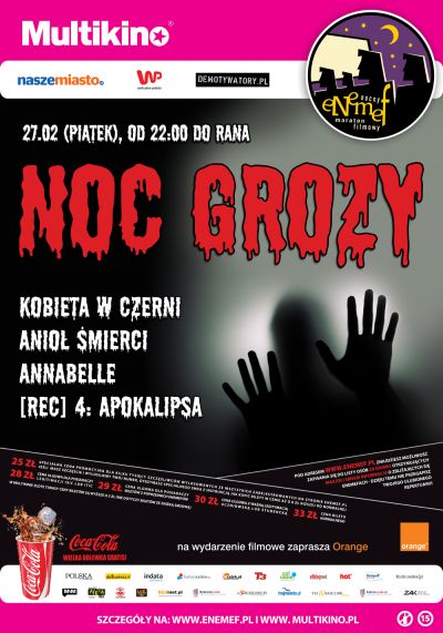 Ostatni piątek października będzie należał do ENEMEF i upłynie pod hasłem: Noc Grozy i Horrorów. Widzowie muszą przygotować się na dużą dawkę strachu i napięcia w postaci przeglądu filmów grozy, które weszły na ekrany polskich kin w ciągu ostatnich miesięcy.